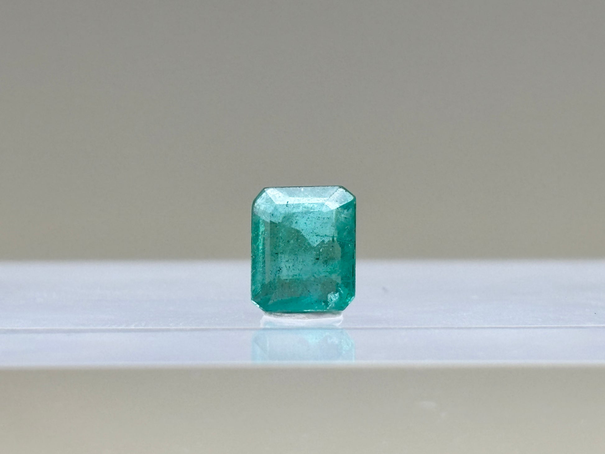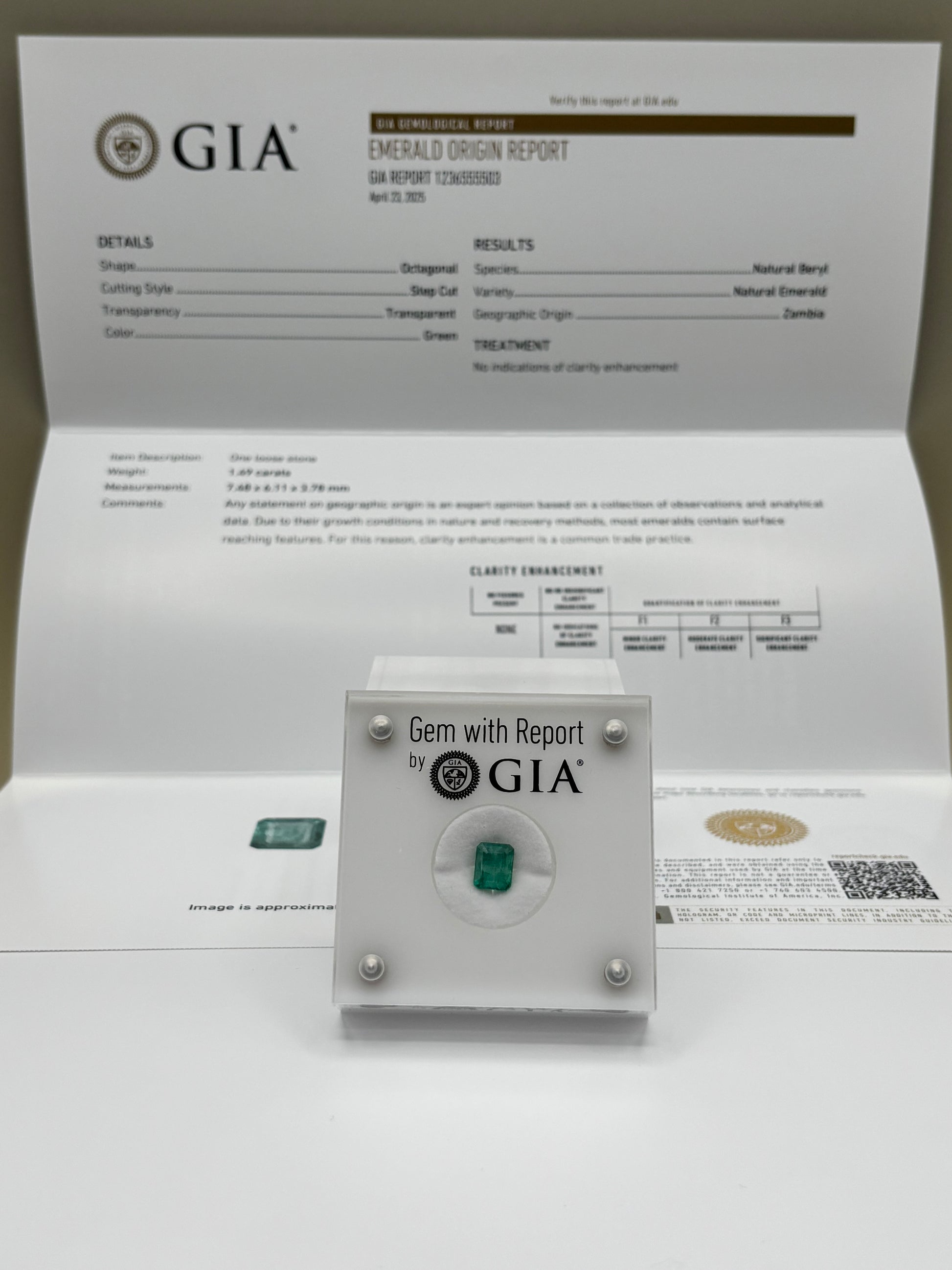 A 1.49 ct Zambian emerald with a classic medium green hue and soft bluish undertones. Octagonal step cut, GIA certified, with no indications of clarity enhancement. Displays fair-to-good lust with visible jardin, offering a natural and authentic look - ideal for a custom jewelry piece.