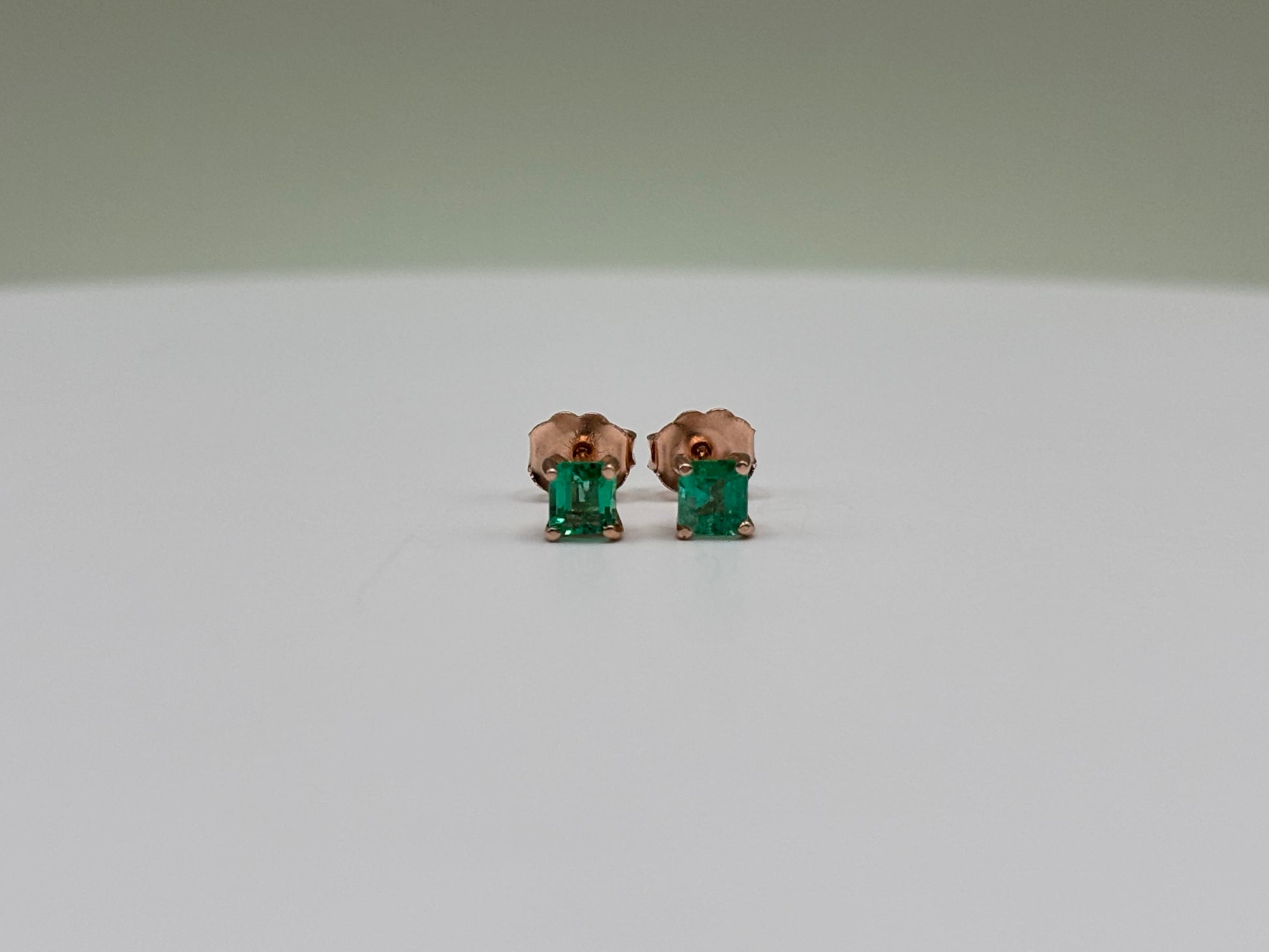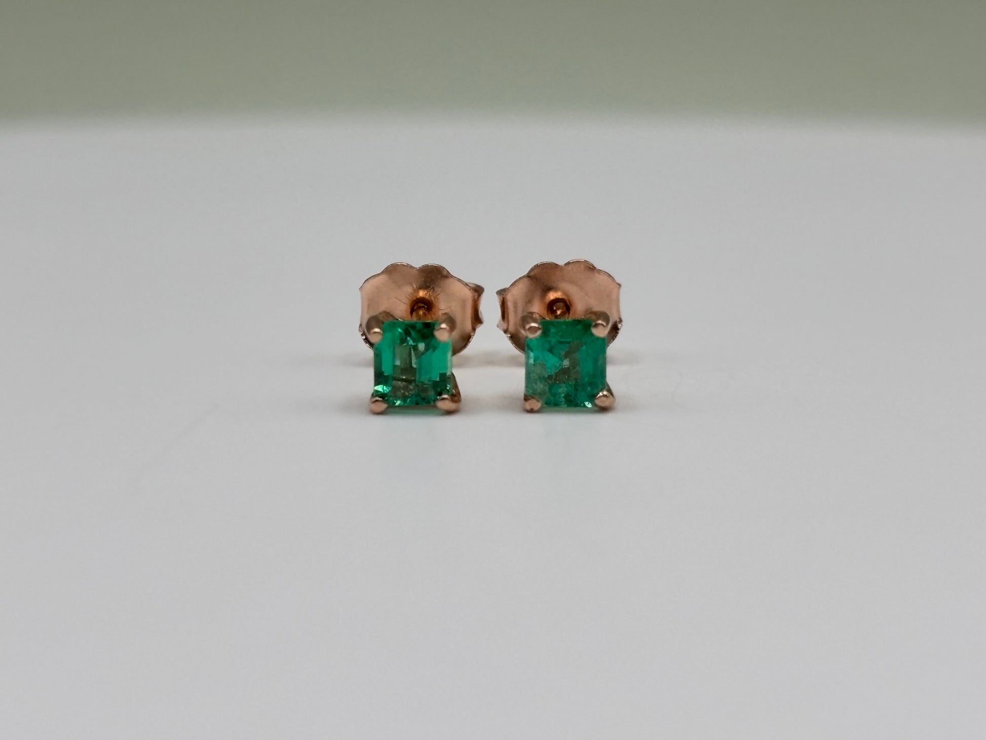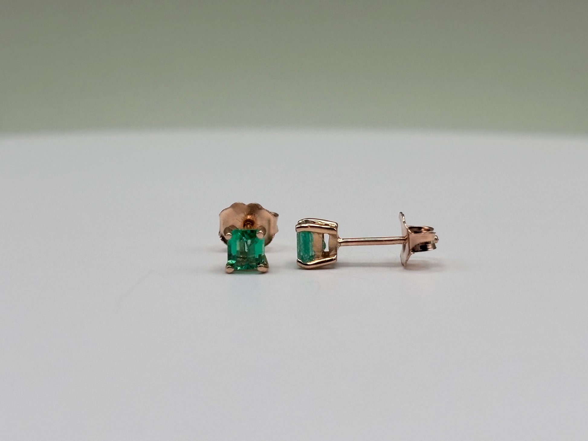 Elegant and timeless, these 14k rose gold stud earrings feature 0.30 carats of vibrant square-cut natural Colombian emeralds. The warm rose gold setting beautifully enhances the rich green hues of the emeralds, making them perfect for everyday wear or a refined evening look. Lightweight and comfortable, they're a versatile addition to any jewelry collection.