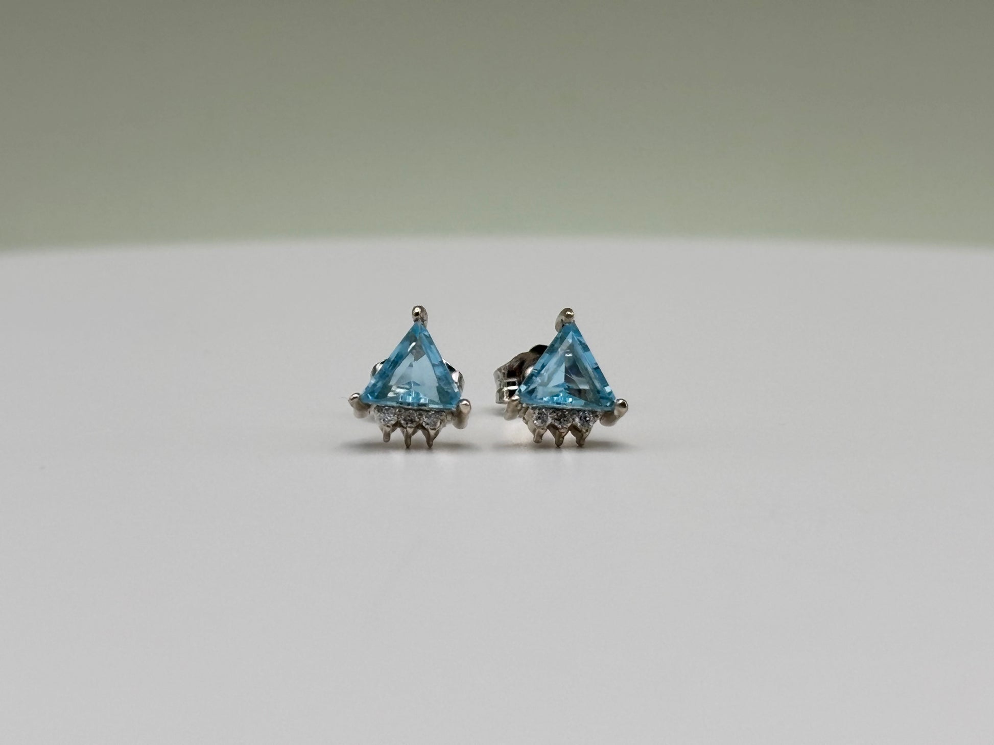 Vivid Swiss blue topaz meets the sparkle of diamonds in these refined earrings. Each stud features a trilliant-cut blue topaz from Brazil, 1.05 carats accented by 0.12 carats of natural diamonds, set in 14k white gold. The perfect balance of bold color and brilliance.