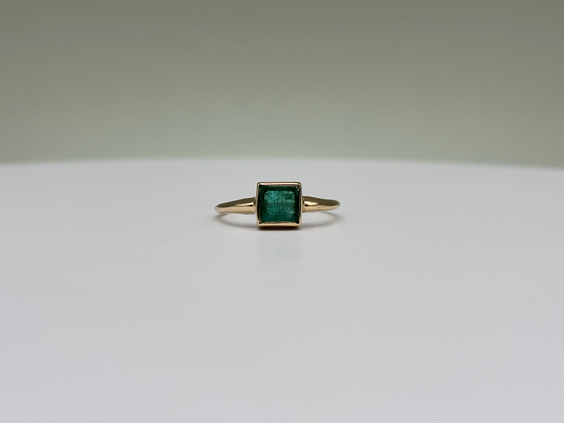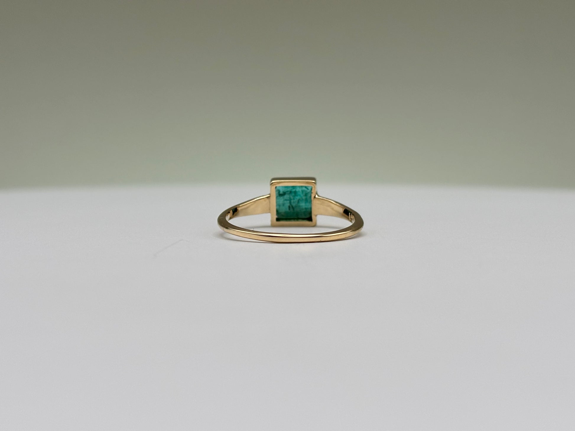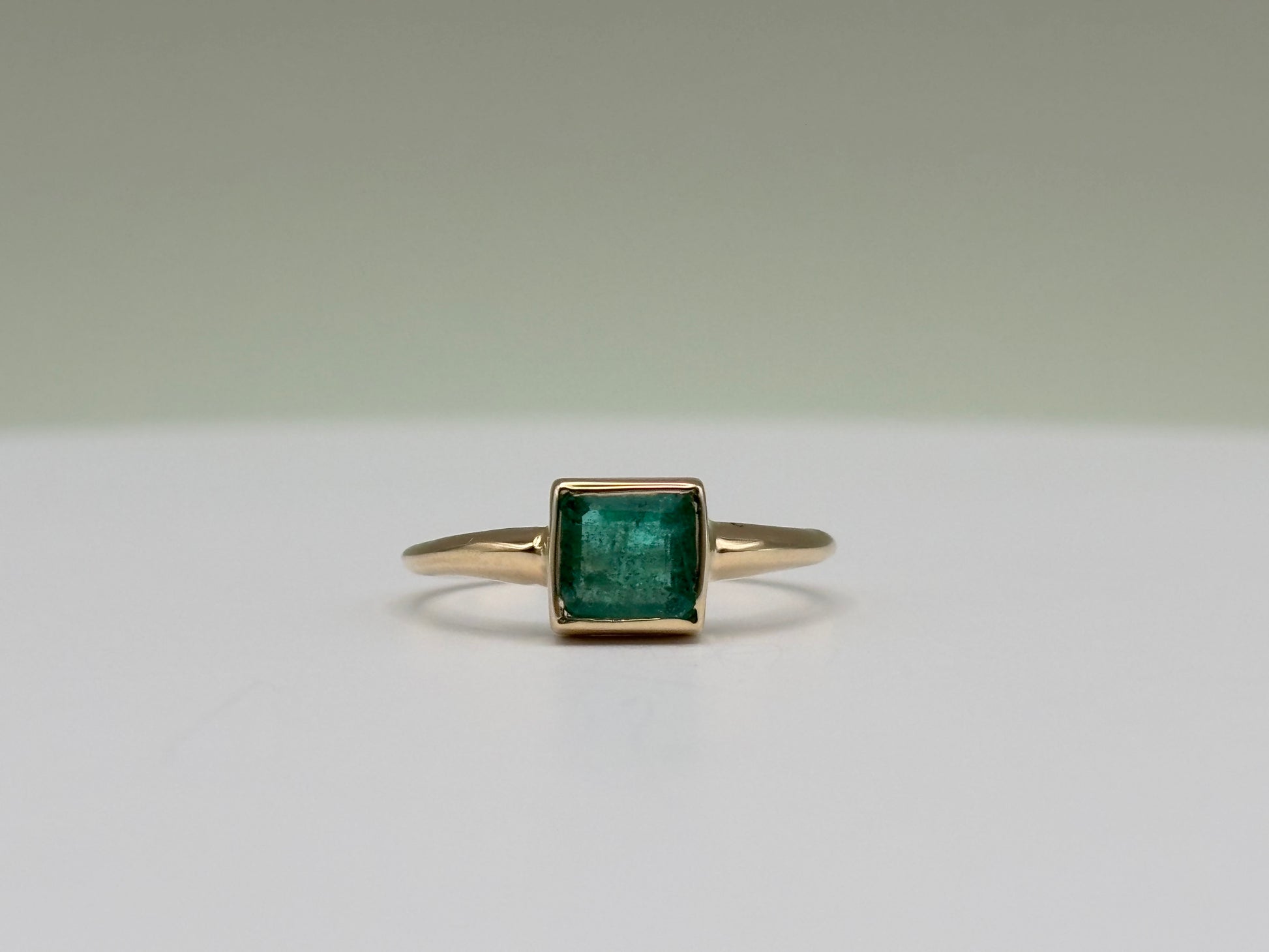 This handcrafted ring features a natural Colombian emerald weighing 1.14 carats, cut in a square shape and secured in a modern bezel setting. Crafted in solid 14k yellow gold, this ring balances durability with elegance, highlighting the emerald's vibrant green color.