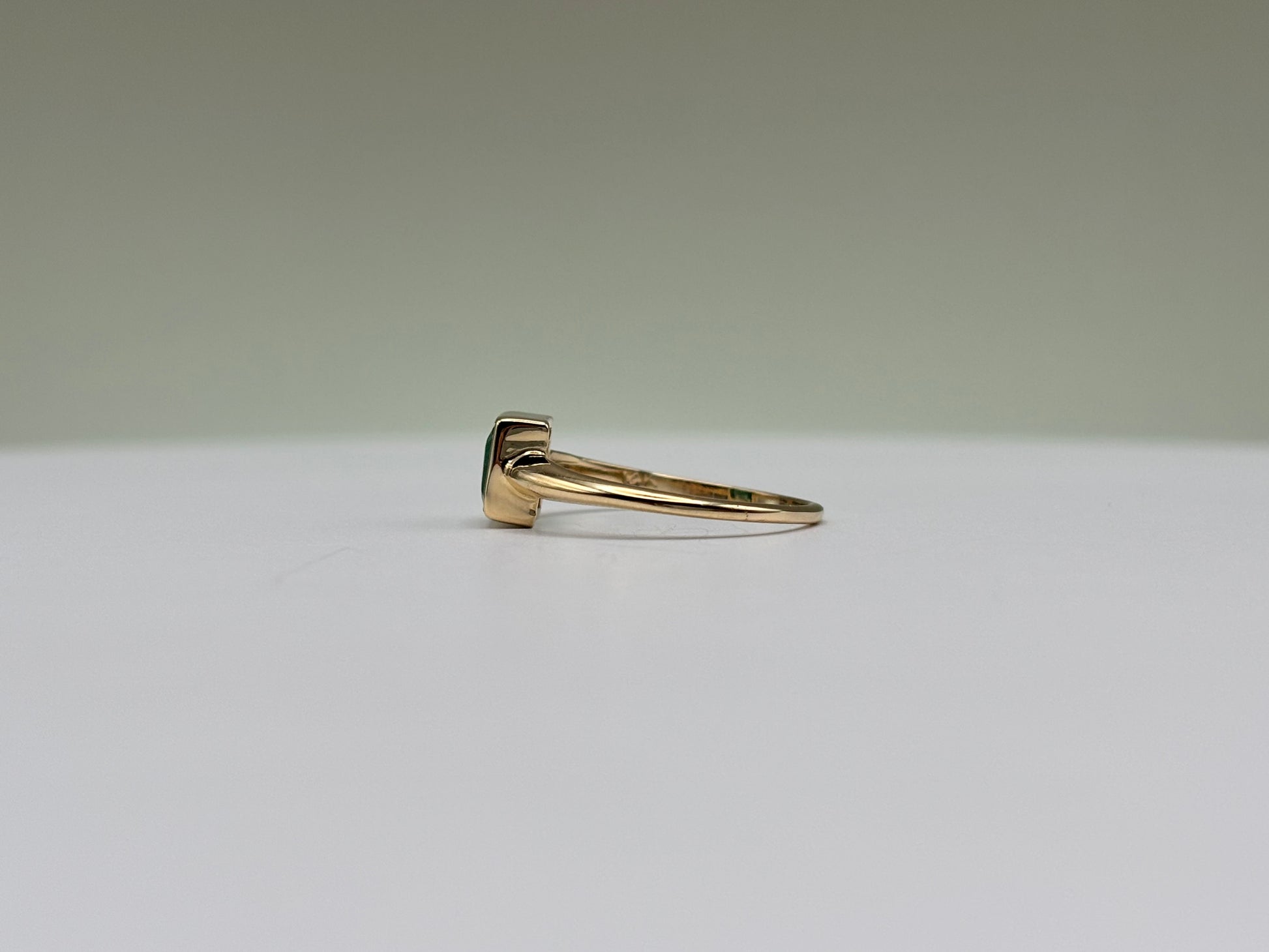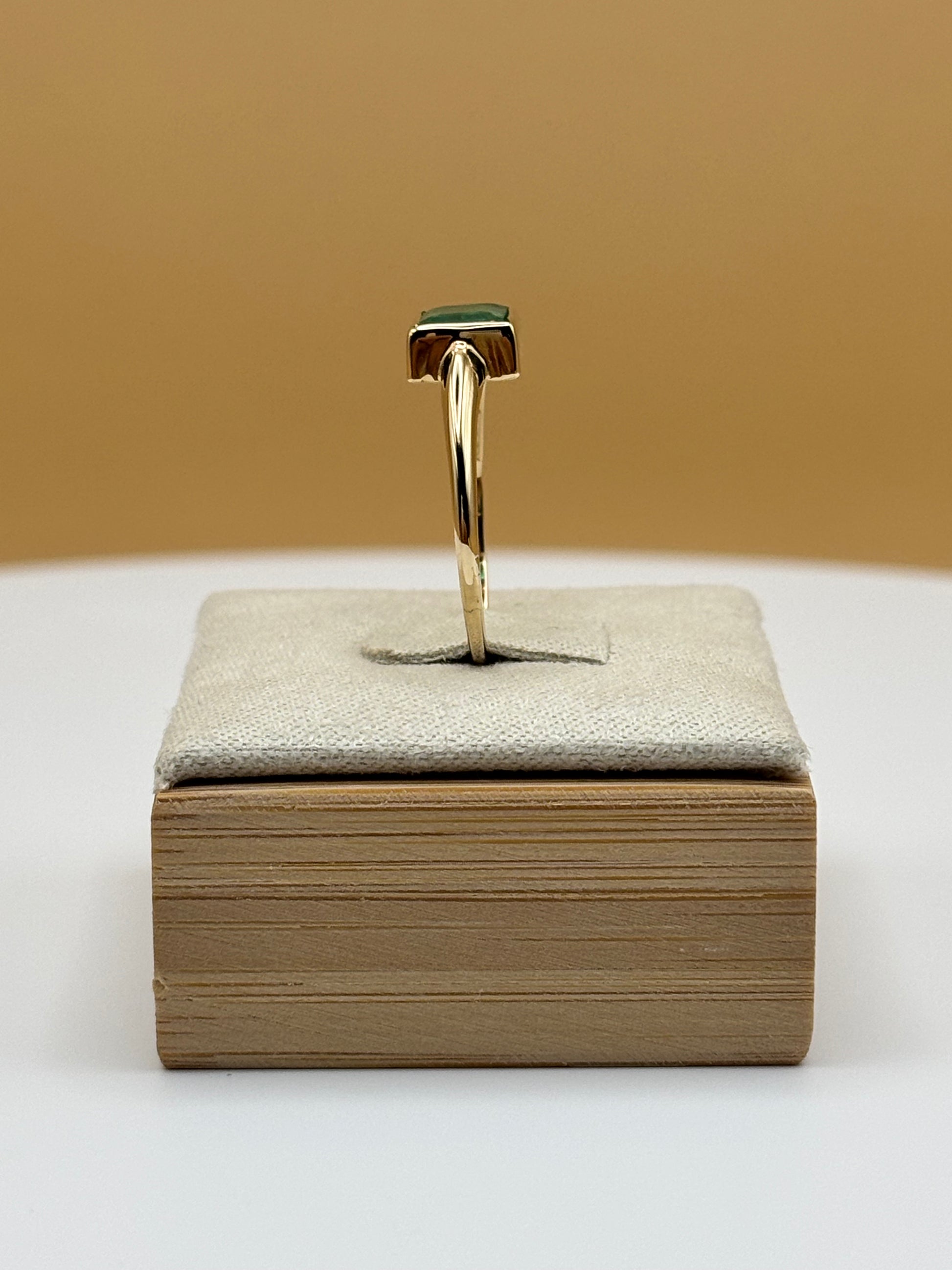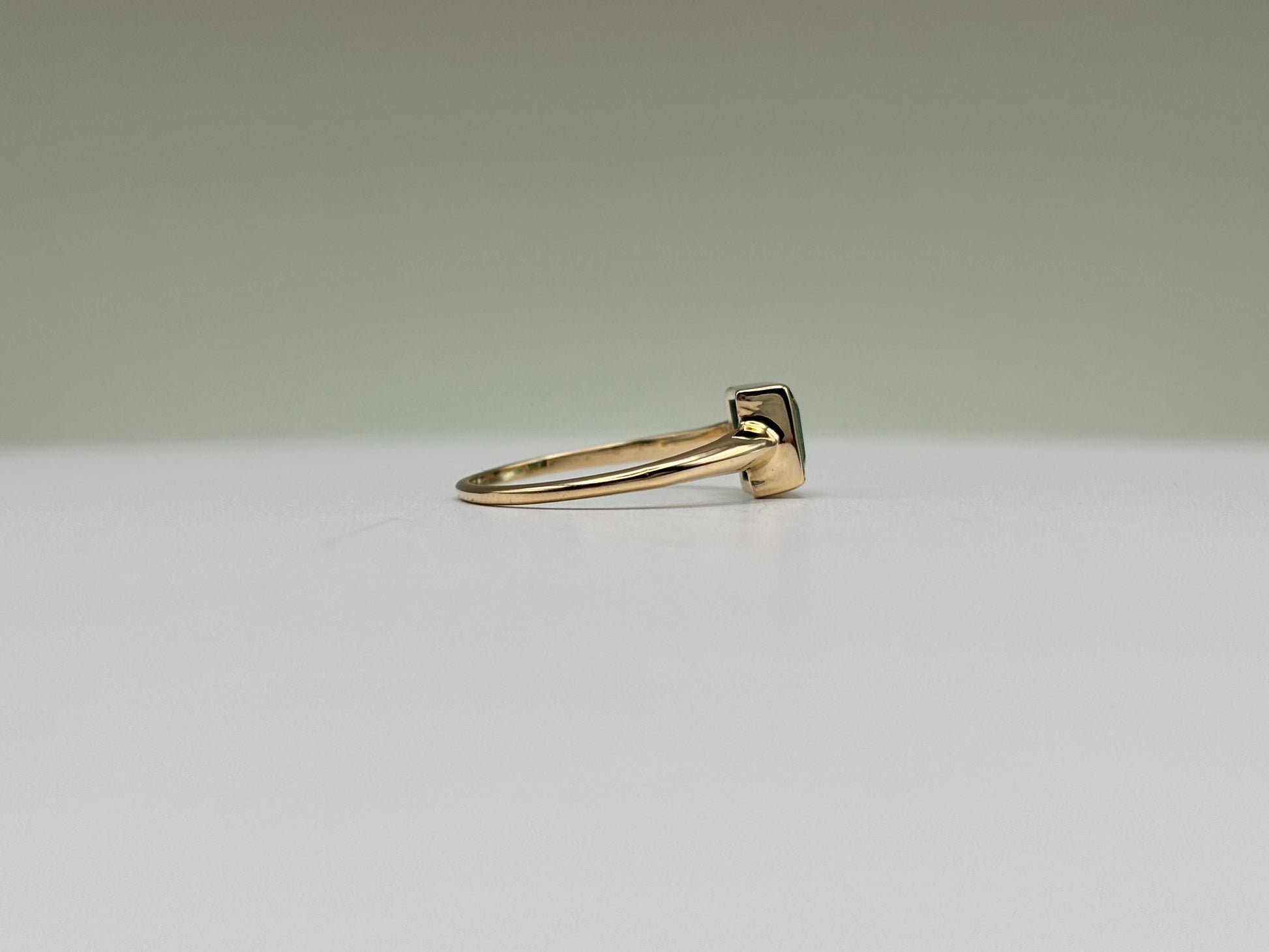 This handcrafted ring features a natural Colombian emerald weighing 1.14 carats, cut in a square shape and secured in a modern bezel setting. Crafted in solid 14k yellow gold, this ring balances durability with elegance, highlighting the emerald's vibrant green color.
