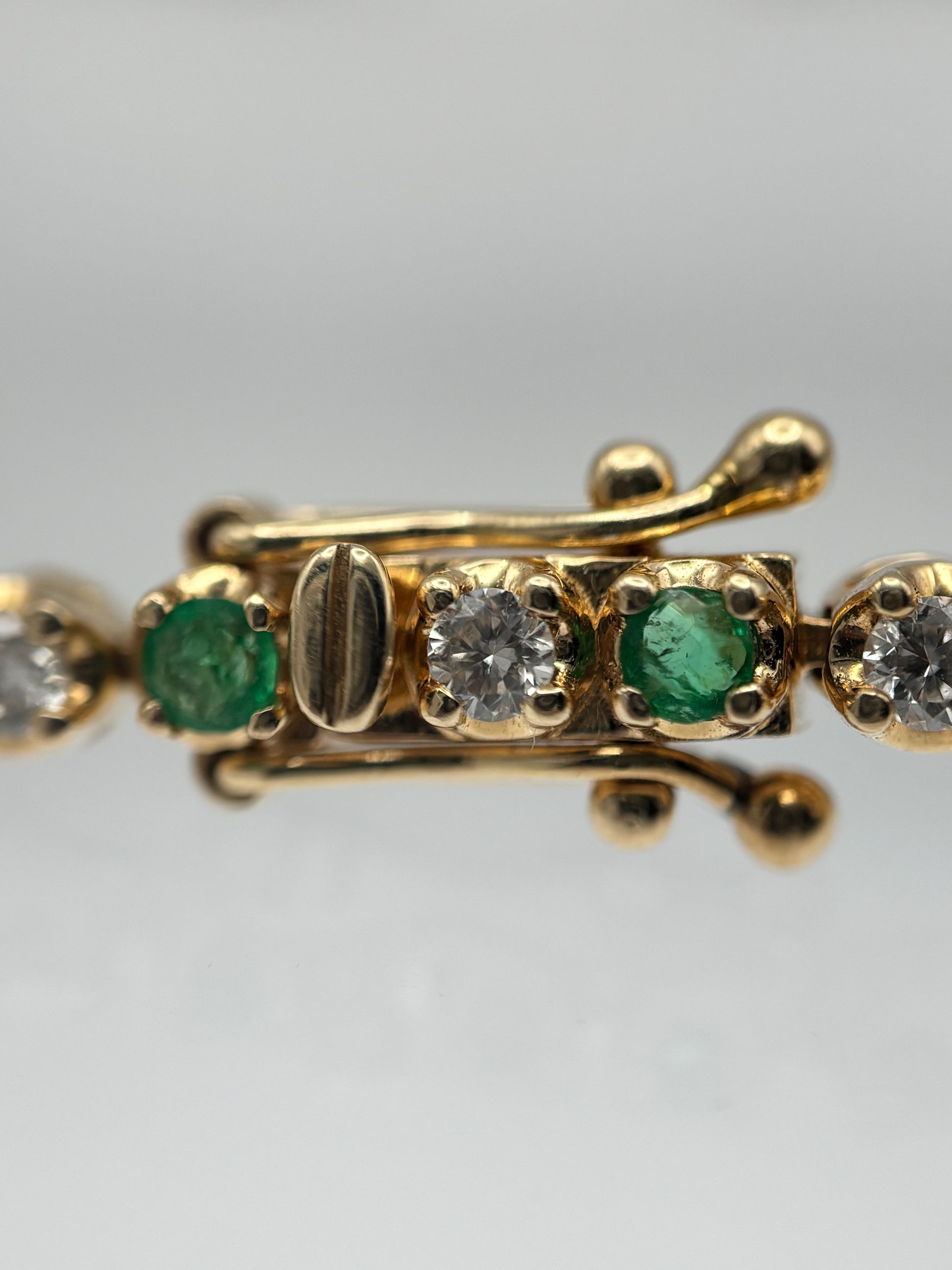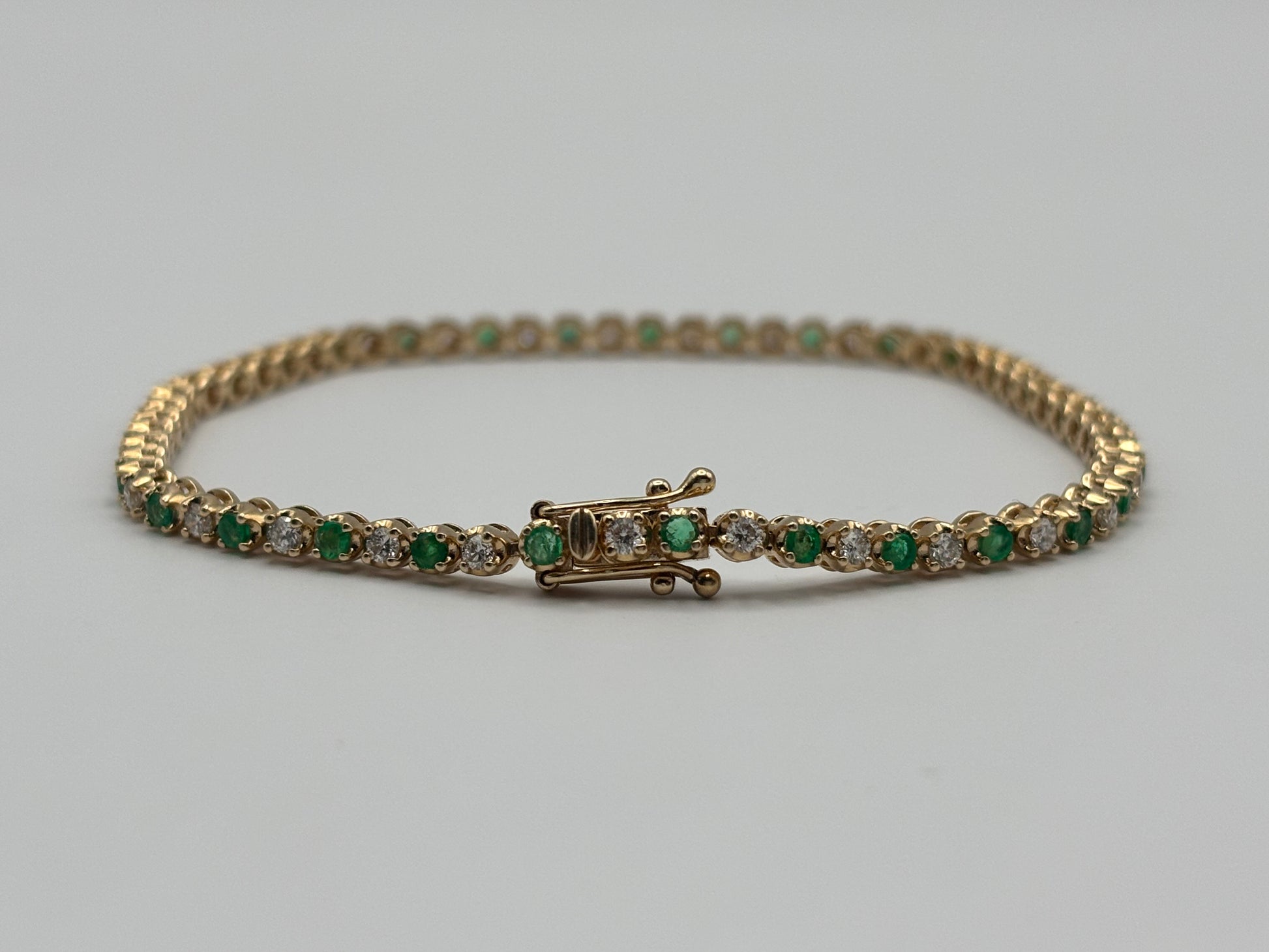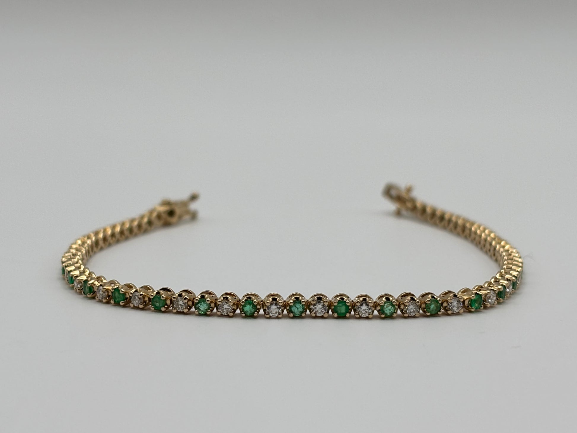 A bracelet of timeless elegance and refined luxury. This 7.5-inch tennis bracelet pairs the vivid green glow of natural emeralds with the brilliant sparkle of diamonds, all handset in 14k yellow gold. Featuring 31 brilliant cut diamonds and 31 round cut emeralds, this piece offers a perfect balance of color and brilliance.
