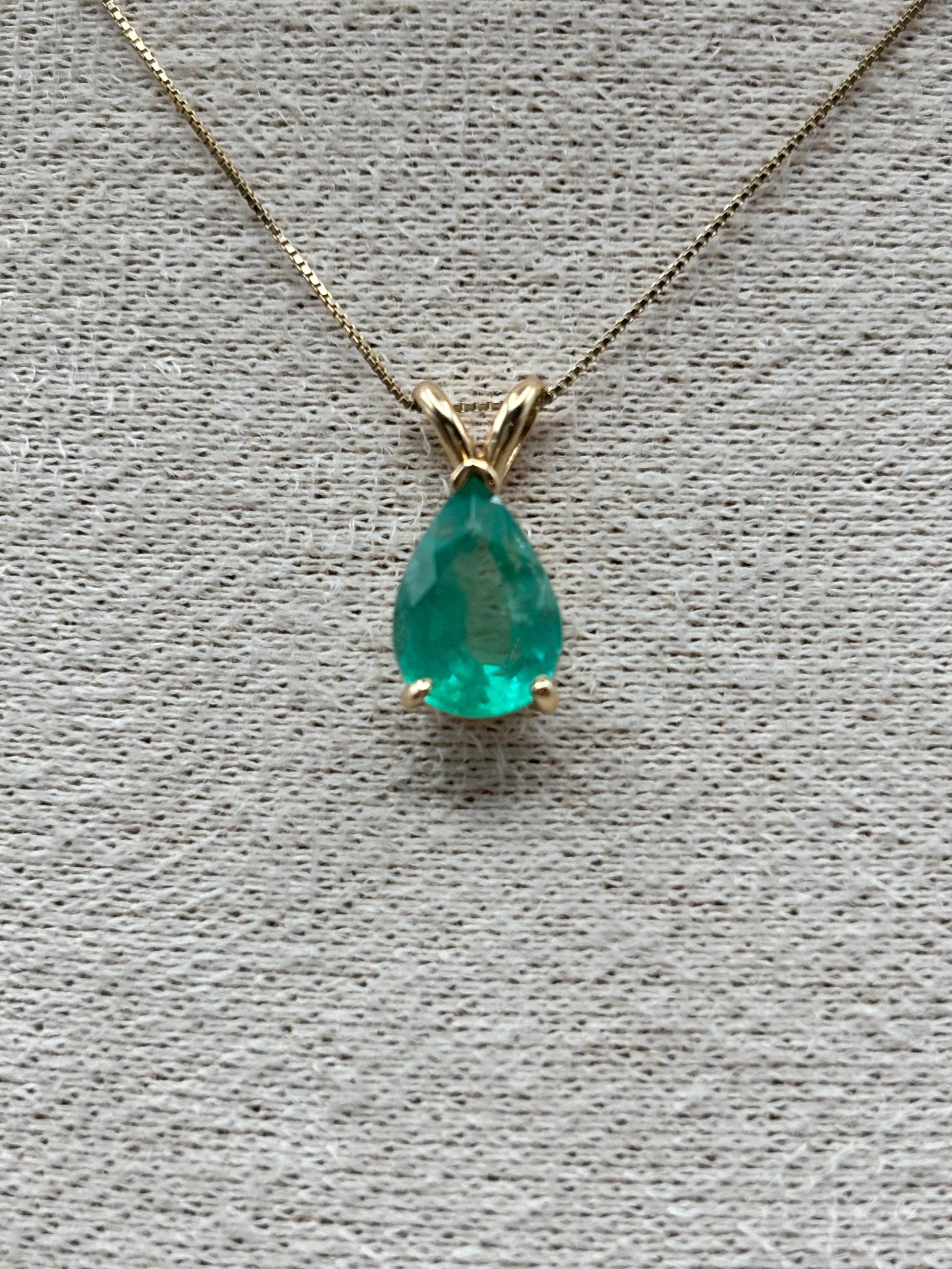 A striking pendant that highlights the vivid green glow of a natural Colombian emerald. This piece features a 1.70 carat pear-cut Colombian emerald, securely set in a classic 14k yellow gold three-prong basket. Suspended from an 18" 14 k yellow gold box chain, the design balances elegance with timeless simplicity, allowing the gemstone's natural beauty to shine.
