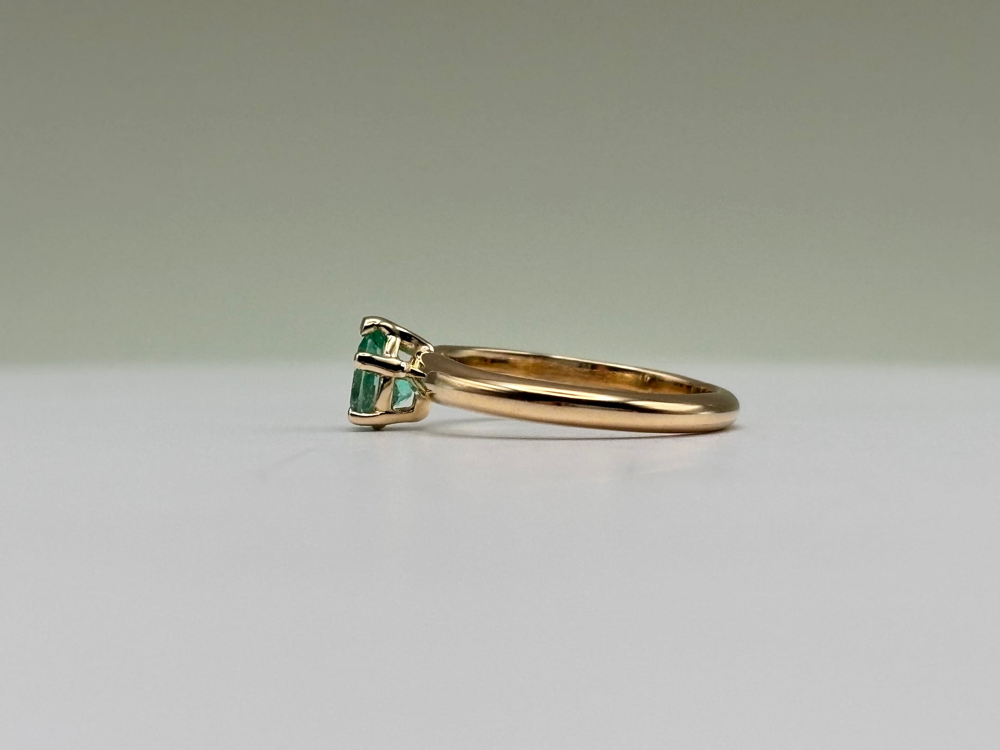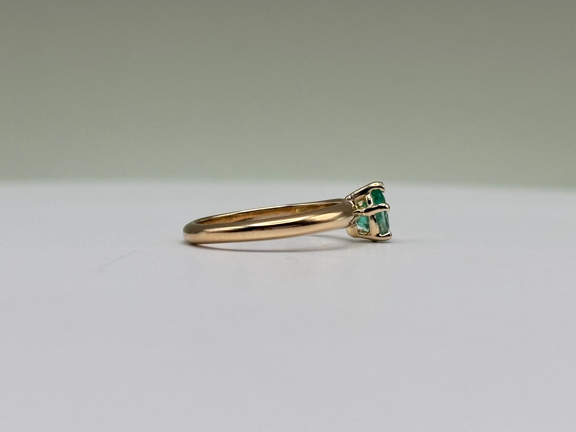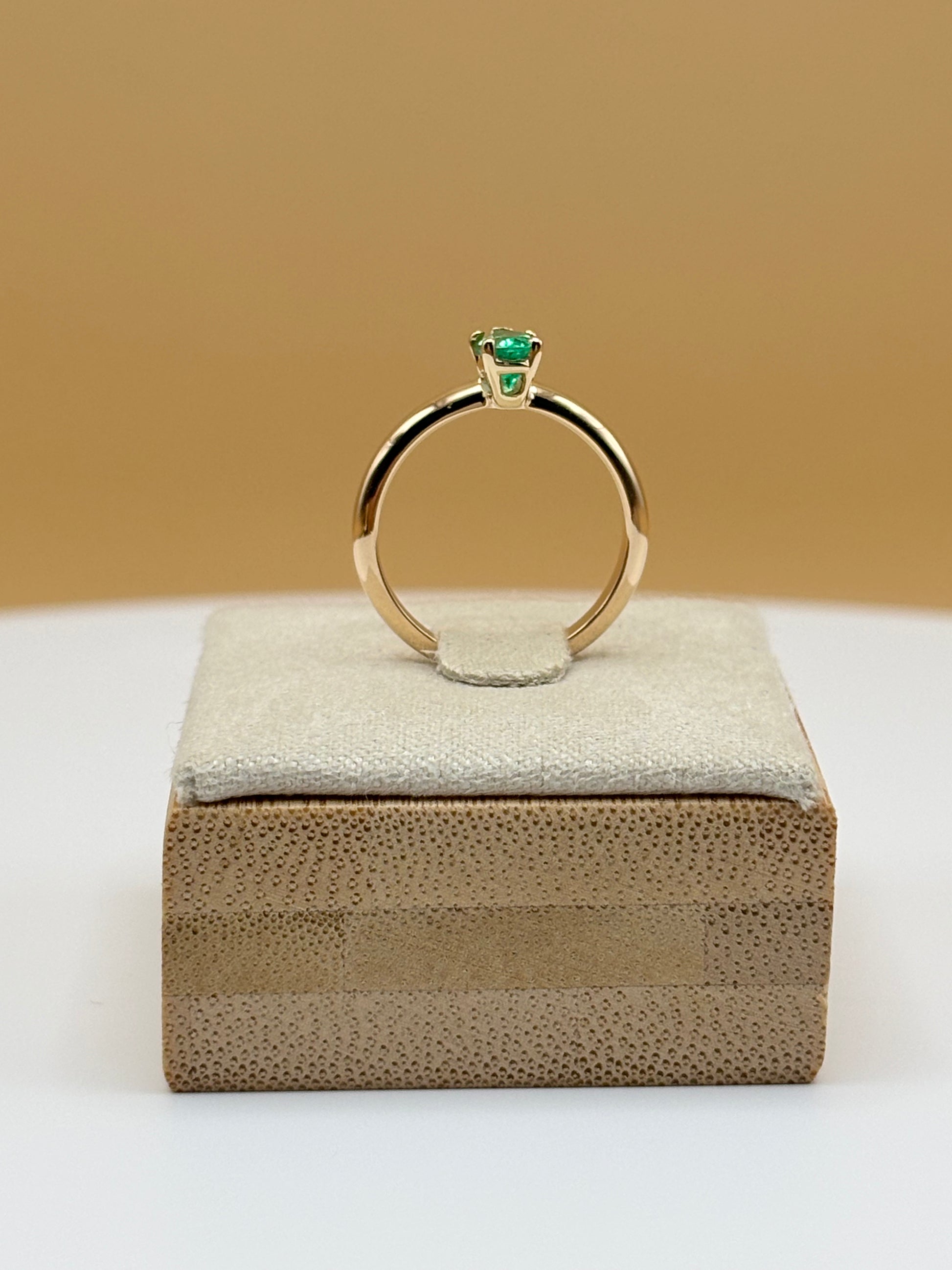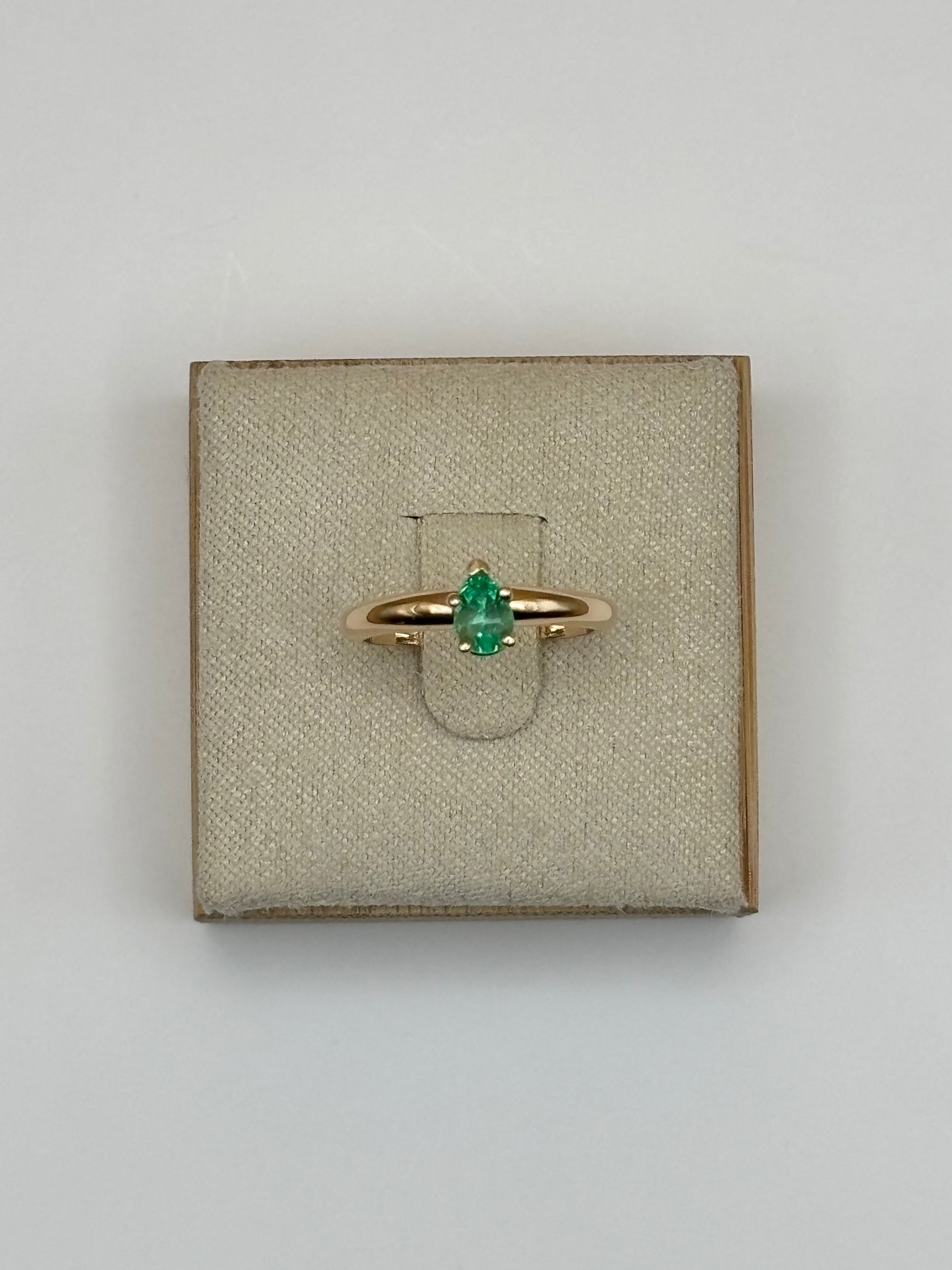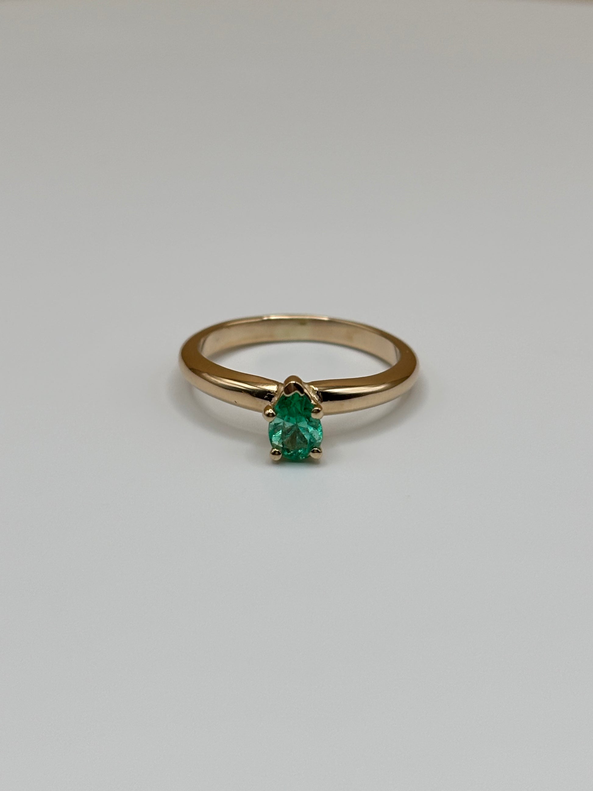 This delicate solitaire ring features a natural Colombian emerald weighing 0.32 carats, cut in a pear shape and secured in a 5-prong setting. The extra prongs enhance both the stone's security and symmetry, while still keeping the emerald as the centerpiece. Crafted in solid 14k yellow gold, this ring offers a timeless, elegant style that highlights the vivid green hue of the emerald.