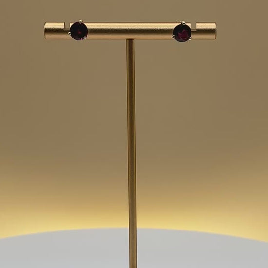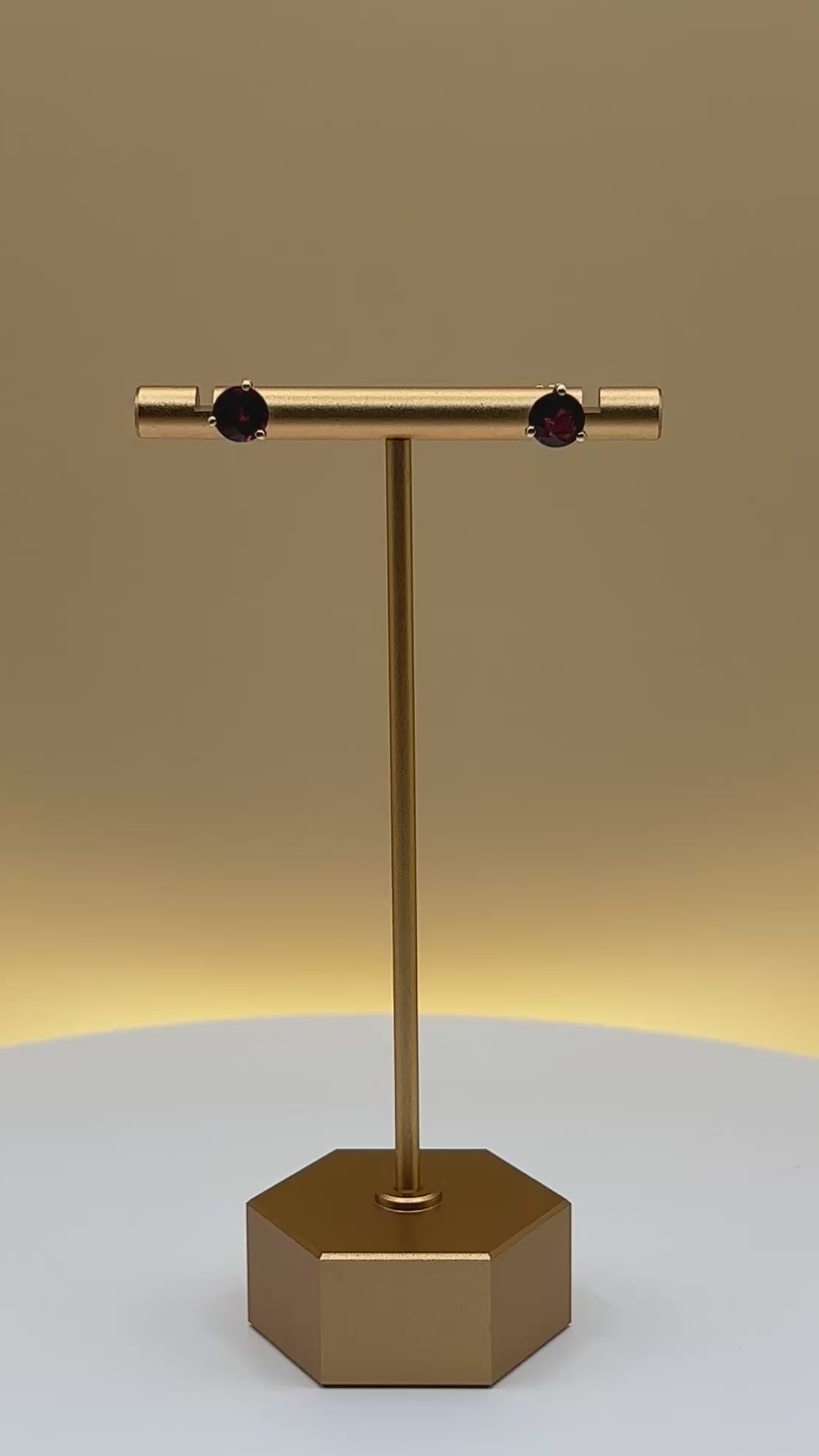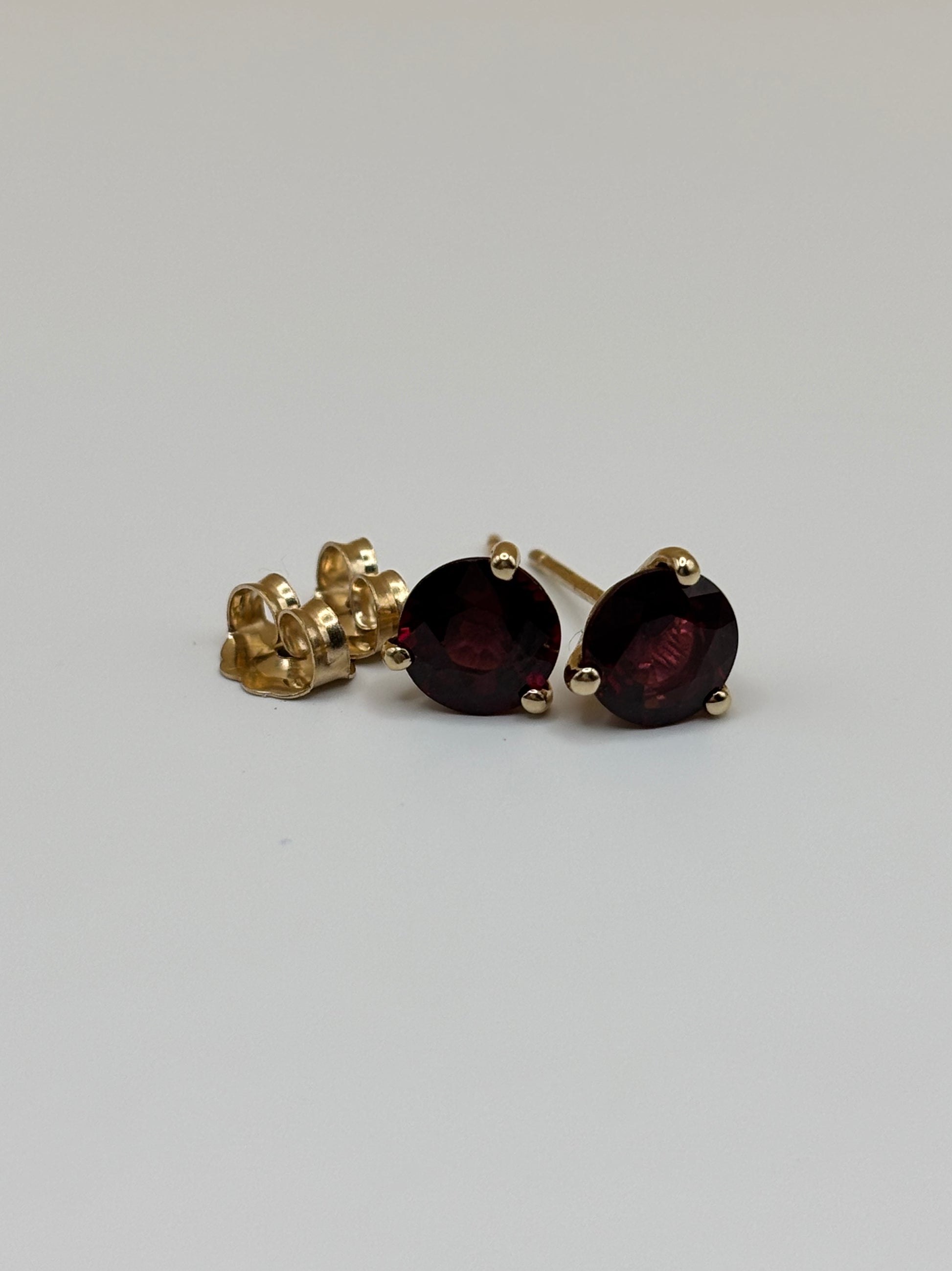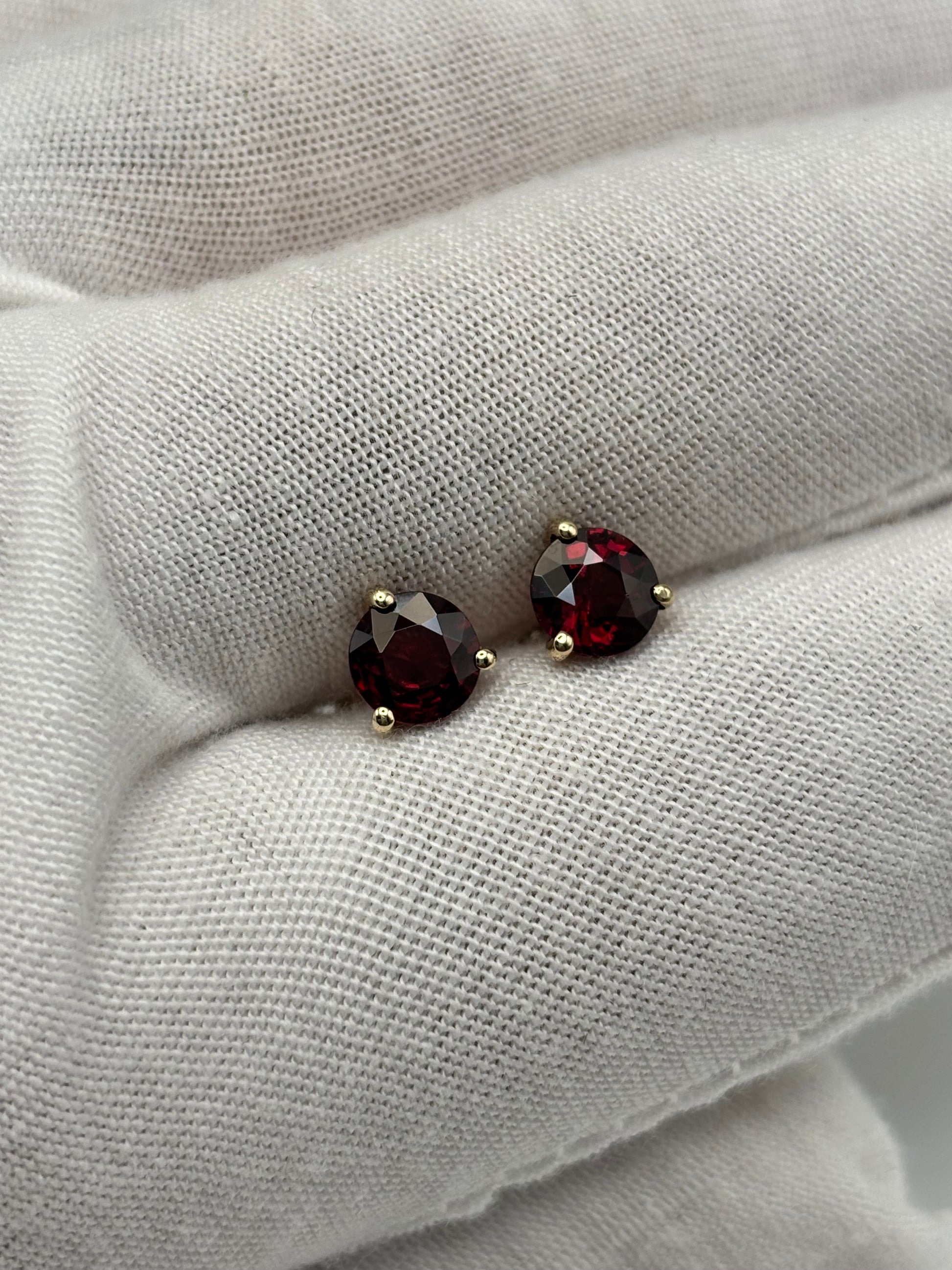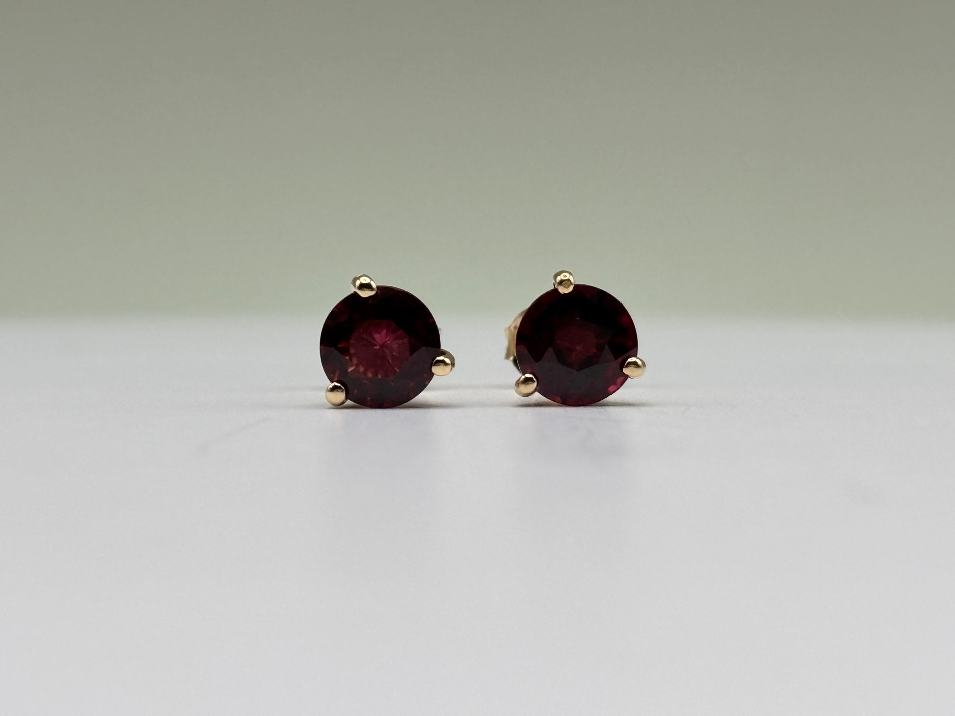 Classic and bold, these studs feature natural purplish pink rhodolite garnets from Madagascar totaling 2.52 carats, securely set in a 14k yellow gold martini setting. The deep red hue makes them an elegant and timeless choice for both everyday wear and special occasions.