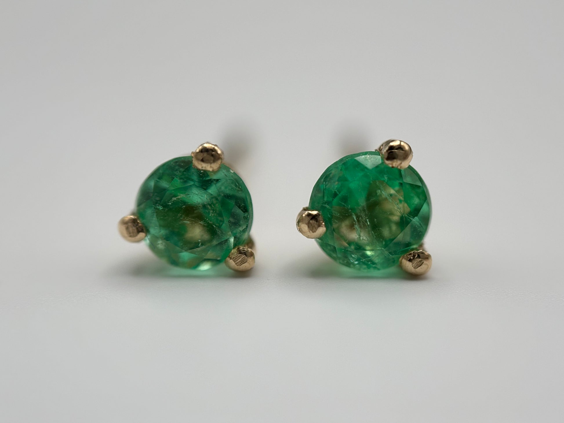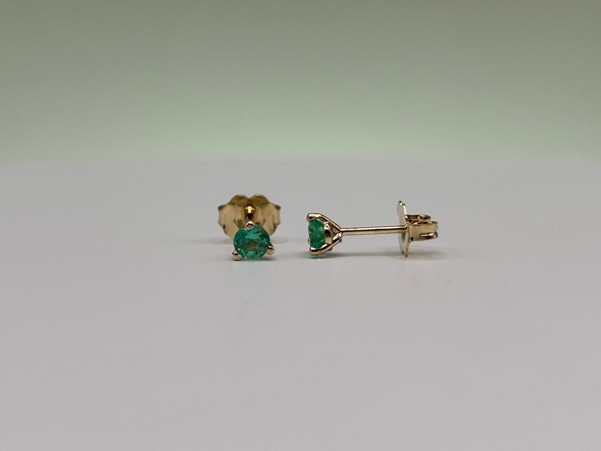 Each earring features a round emerald, securely set in a 14k yellow gold three-prong martini setting with push backs for comfort and security. These emerald studs make the perfect size for everyday luxury or a meaningful May birthstone.