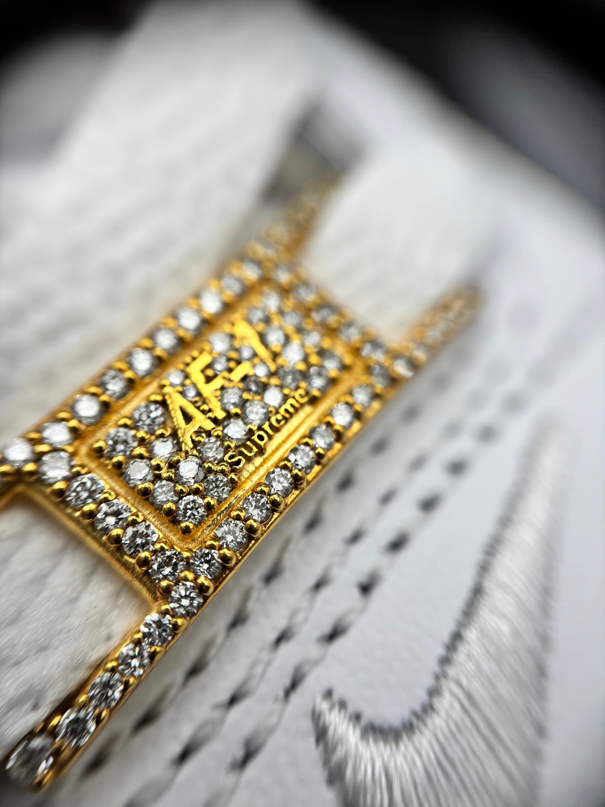 AF1 Supreme Shoe Tags available in 10k or 14k gold - in white, rose or yellow.