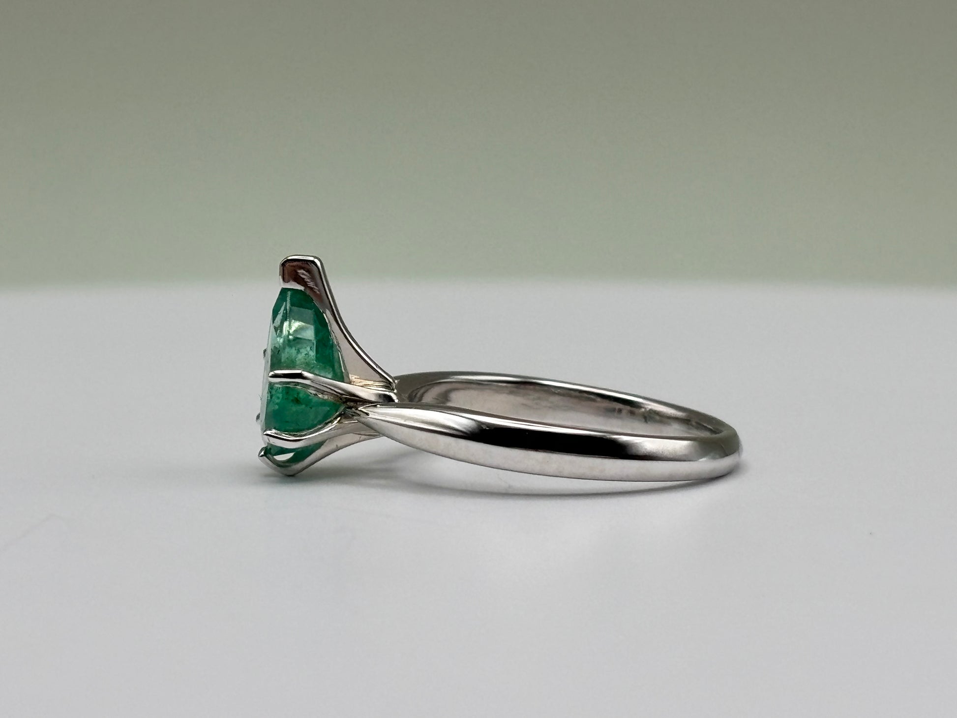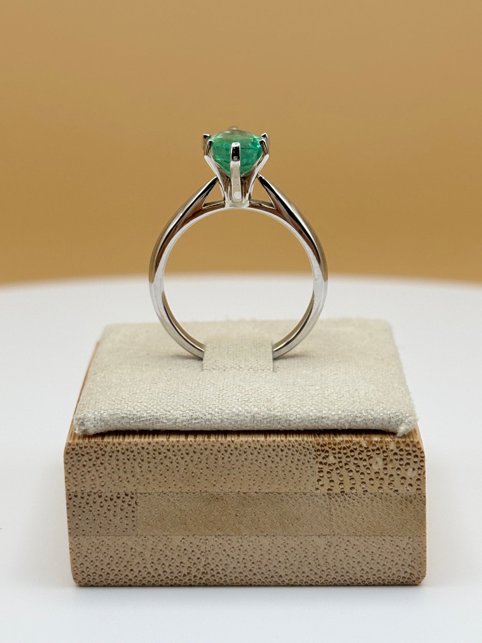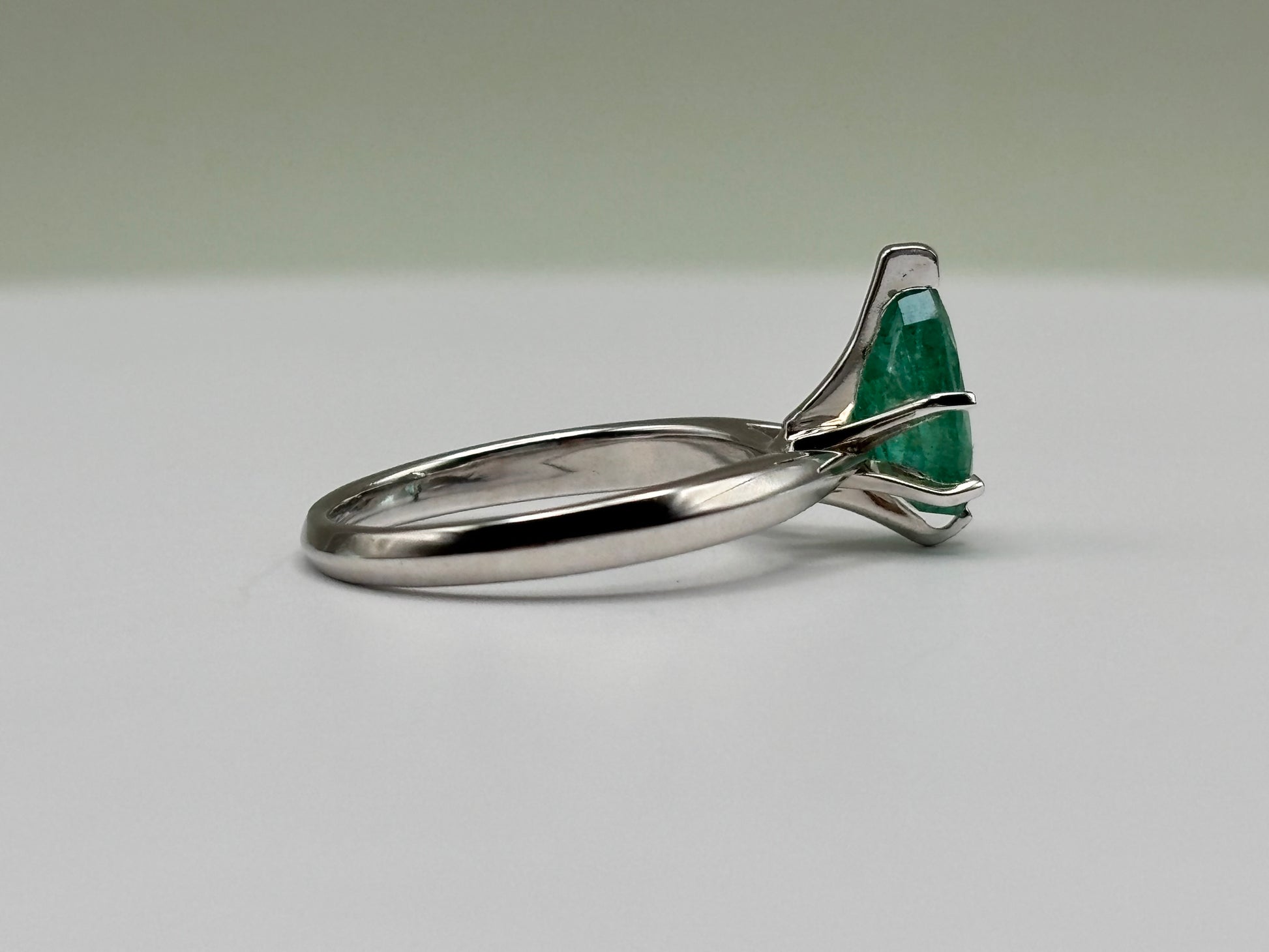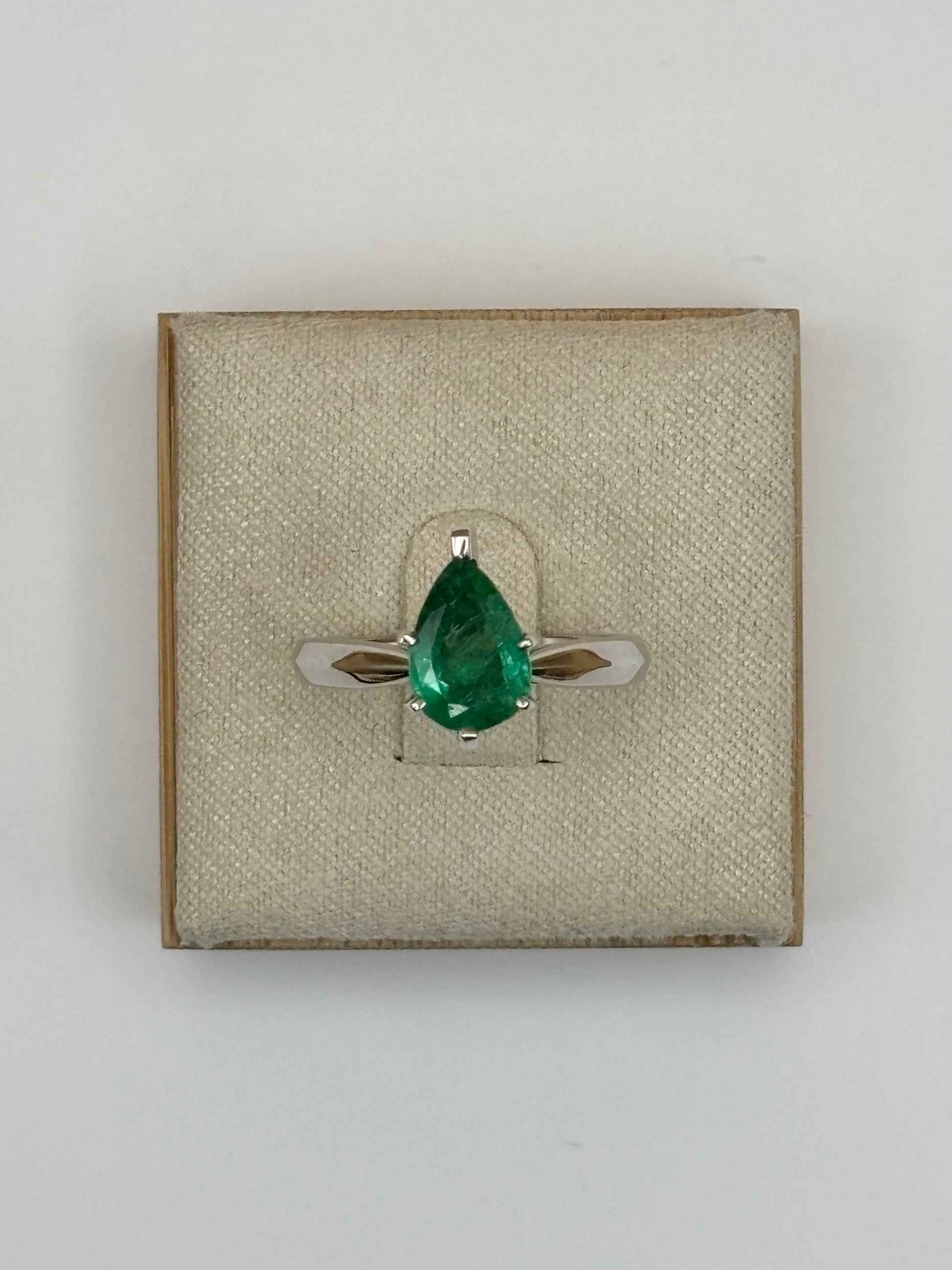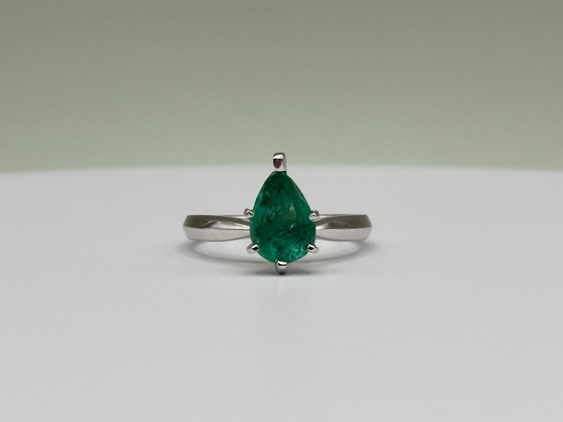 This elegant solitaire ring showcases a natural pear-cut Colombian emerald weighing 1.64 carats, hand-selected for its vivid green color and brilliance. The gemstone is set in solid 14k white gold with a sleek high-polish finish, designed to highlight the emerald's beauty without distraction.